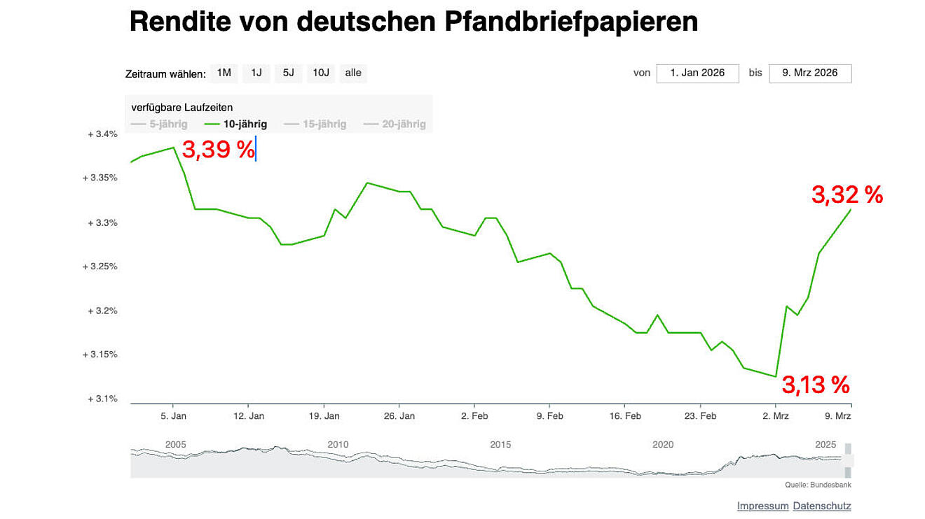 - Die Frankfurter Volksbank erhöht zum 09.03.2026 ihre Konditionen in allen Beleihungsausläufen um bis zu + 0,10 %